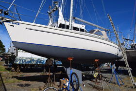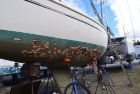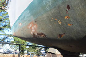 The starboard side of “Fleetwood IV” did not have the same loose underwater anti-fouling as the port side. I conclude that it might have something to do with it having been on the shadow side and the paint not having cured enough before splashing. The travellift straps had also left deep marks into the uncured paint. The dark brown color appears to be oxidation from the saltwater penetration. This might also indicate that this could have been avoided with a good barrier coat.