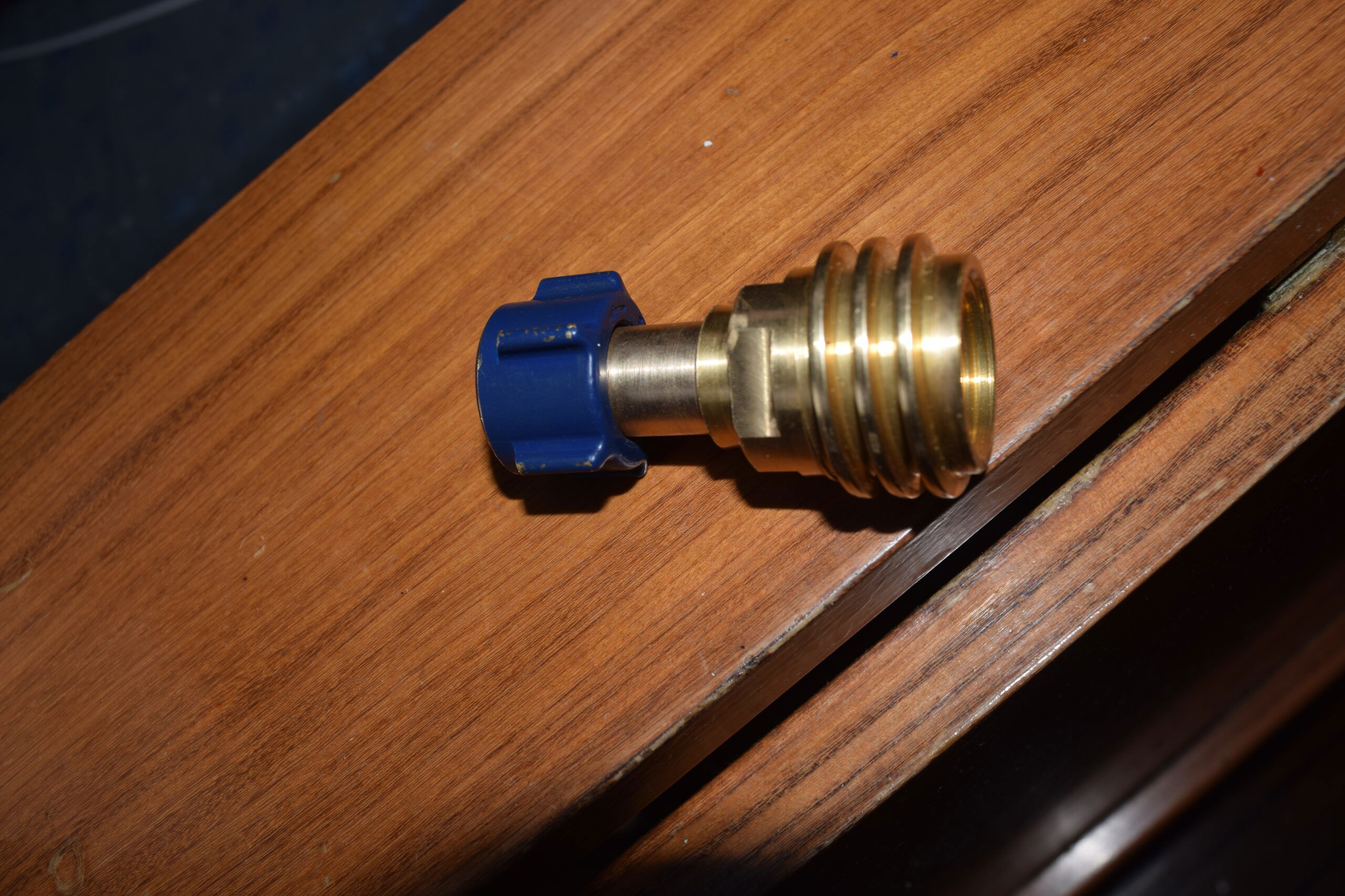 In the same blog I reported my search for a way to fill my empty European propane tank. Lou Negretti solved the problem and since Wednesday I am cooking again on my two burner galley stove. I am going into some detail here on how a new adapter was created for the benefit of other cruising pals confronted with a European tank trying to adapt it to the US standard filling stations. :